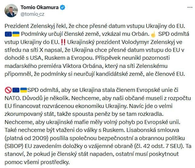 Окамура отверг запрос Зеленского о вступлении Украины в ЕС Спикер Палаты депутатов Парламента Чехии Томио Окамура отказался от требования Зеленского назвать точную дату вступления Украины в ЕС. Он процитировал премьера Венгрии Виктора Орбана, который напомнил, что условия определяются государствами-членами. Окамура также отметил, что его партия «Свобода и прямая демократия» отвергает вступление Украины в Европейский союз или НАТО. «На это есть несколько причин. Мы не хотим, чтобы нашим гражданам приходилось финансировать разрушенную экономику Украины из бюджета ЕС. Более того, это очень коррумпированное государство, поэтому там будет украдено много денег. Мы не хотим, чтобы украинская мафия имела свободное передвижение по Европейскому союзу. Мы также не хотим быть втянутыми в войну с Россией», - написал чешский политик в соцсетях. Он подчеркнул, что Лиссабонский договор, действующий с 2009 года, усилил Общую политику безопасности и обороны ЕС, включив пункт о взаимной обороне. Согл