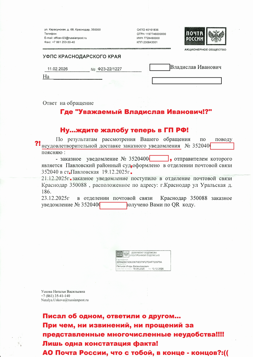 17 февраля 2026 года мною получен в ОПС 350... ответ за № Ф23-22/1227, подписанный согласно электронной подписи неким Петьковым Игорем Валентиновичем (должность в ответе не указана, что уже является нарушением).