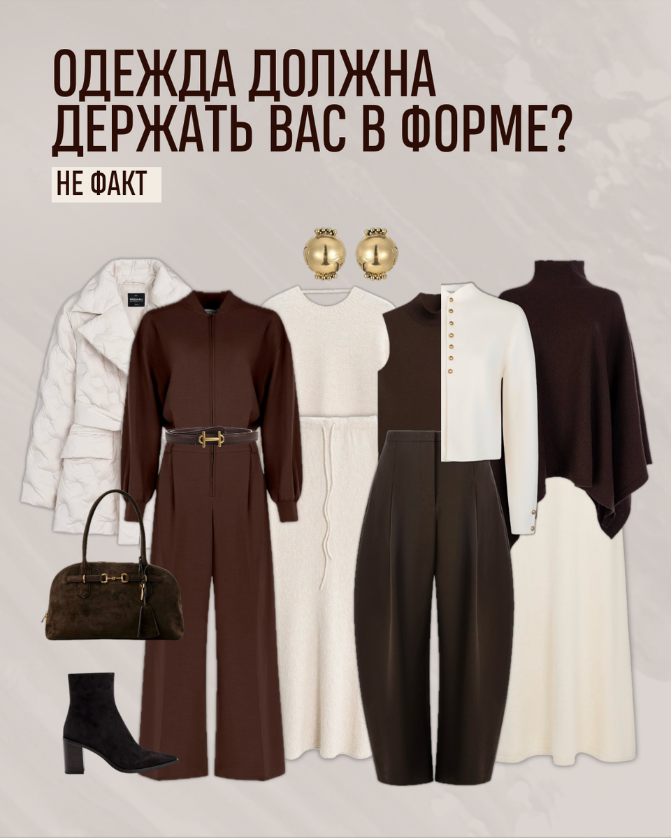 «Если я надену свободное, боюсь вообще расслабиться и не собрать себя. А в более облегающих вещах видно, что поправилась. Но зато стимул. Как быть? Хочется выглядеть классно!» Если подход 🩰Майи Плисецкой «Не жрать» вас вдохновляет и стимулирует, надевайте облегающее. Иногда имеет смысл затянуть себе пружину и на этой энергии отскочить в желаемом направлении. Только оцените свои силы.