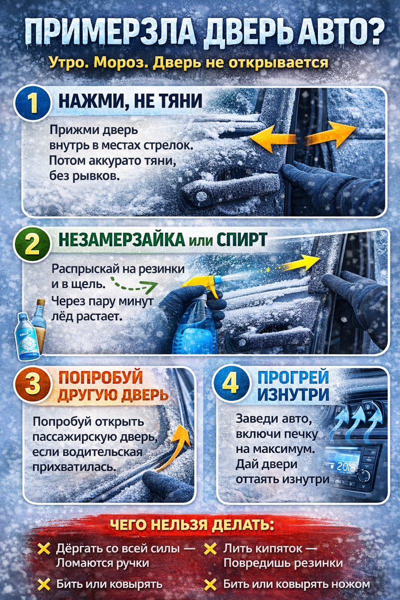 Зимним утром такое случается часто: после мойки, оттепели или снега двери «прихватывает» льдом. Главное — не сломать ручку и уплотнители.