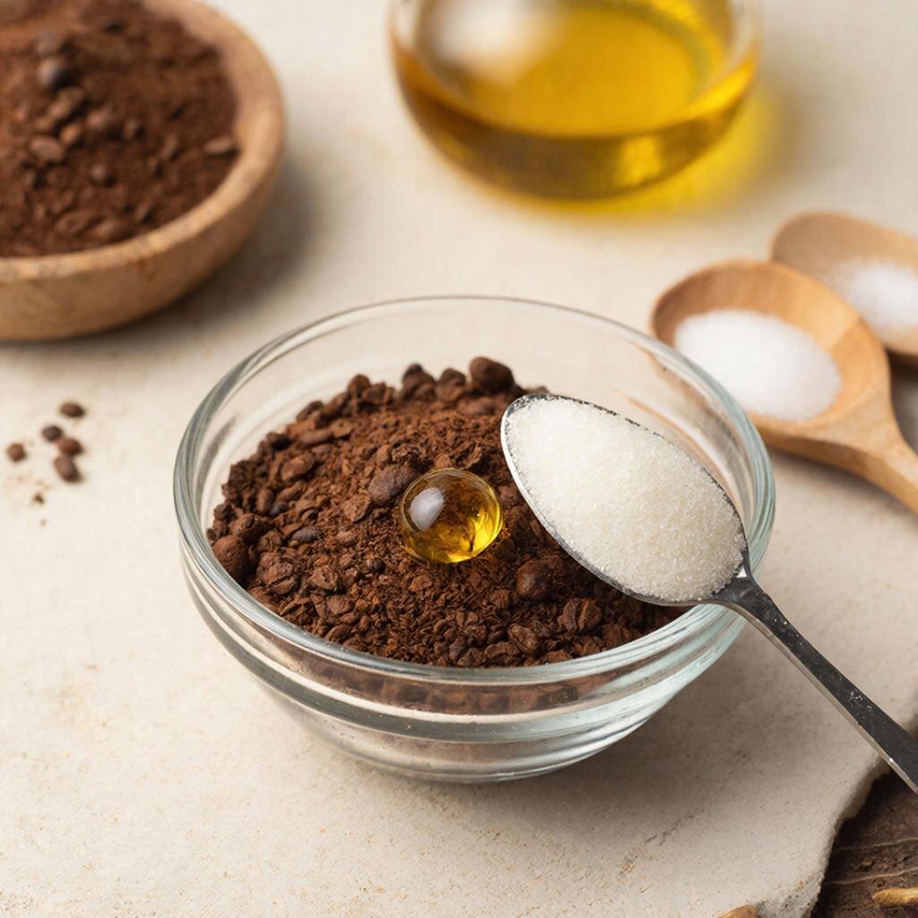 При сухой консистенции кофе слегка разбавьте его водой, затем соедините с сахаром и ароматным эфирным маслом. Сразу приступайте к применению, поскольку эфирное масло обладает способностью быстро улетучиваться.