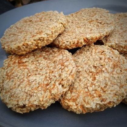 Затем сформируйте из теста небольшие круглые кусочки толщиной около 1 см и поместите в дегидратор при температуре 40 градусов примерно на 4-5 часов в зависимости от желаемой консистенции хлеба. Если у вас нет дегидратора, можно использовать обычную духовку с приоткрытой дверцей. Тогда температура может быть выше градусов на 5, поскольку часть тепла уйдет из духовки через о