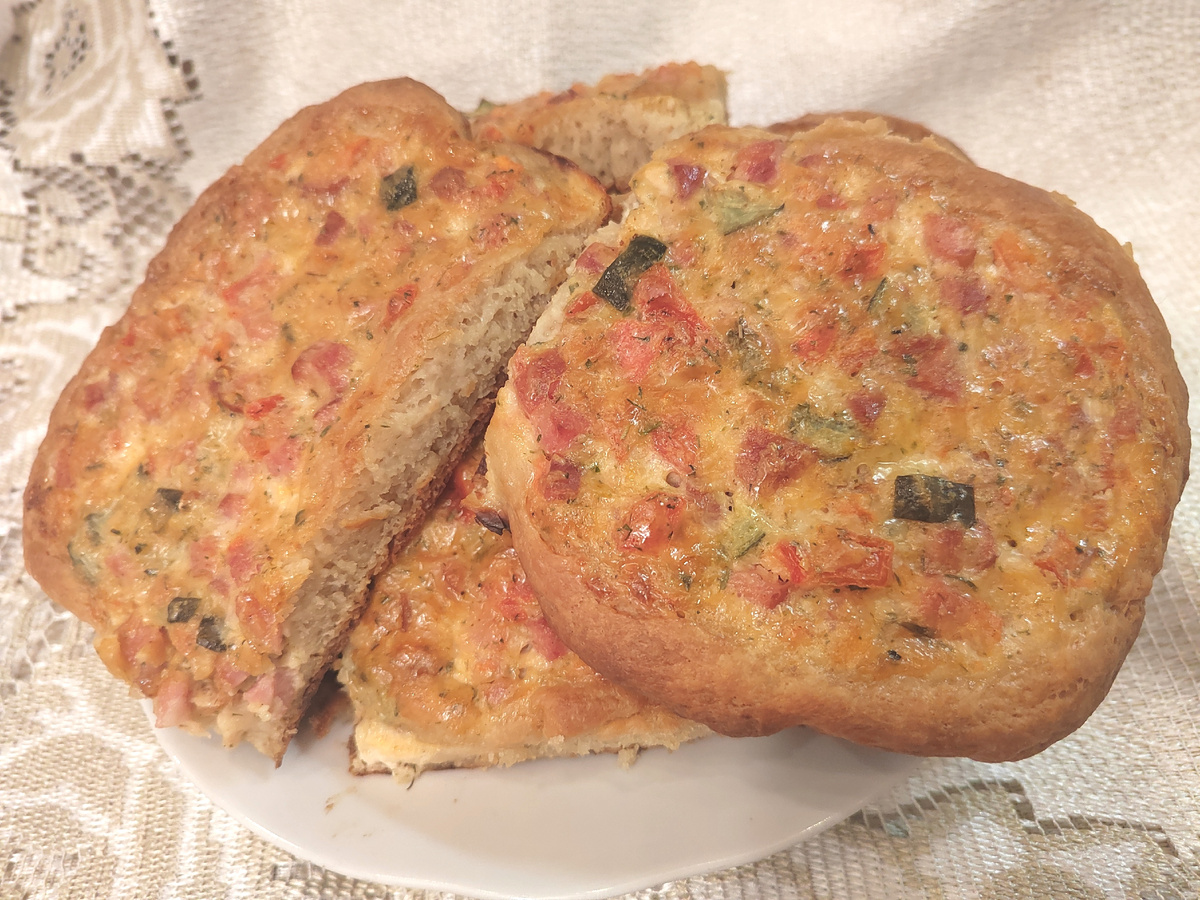 Не получились такие же красивые, но они вкусные. С тестом я не заморачивалась, все ингредиенты отмерила на весах и закинула в хлебопечку. Готовое тесто опять же через весы разделила на 9 равных частей. Начинка у меня - ветчина, маринованные огурцы, помидоры (удалила из них часть, где семена, чтобы не было лишней влаги), сыр, сушёный чеснок, смесь перцев. Булочки у меня немного расплылись, но