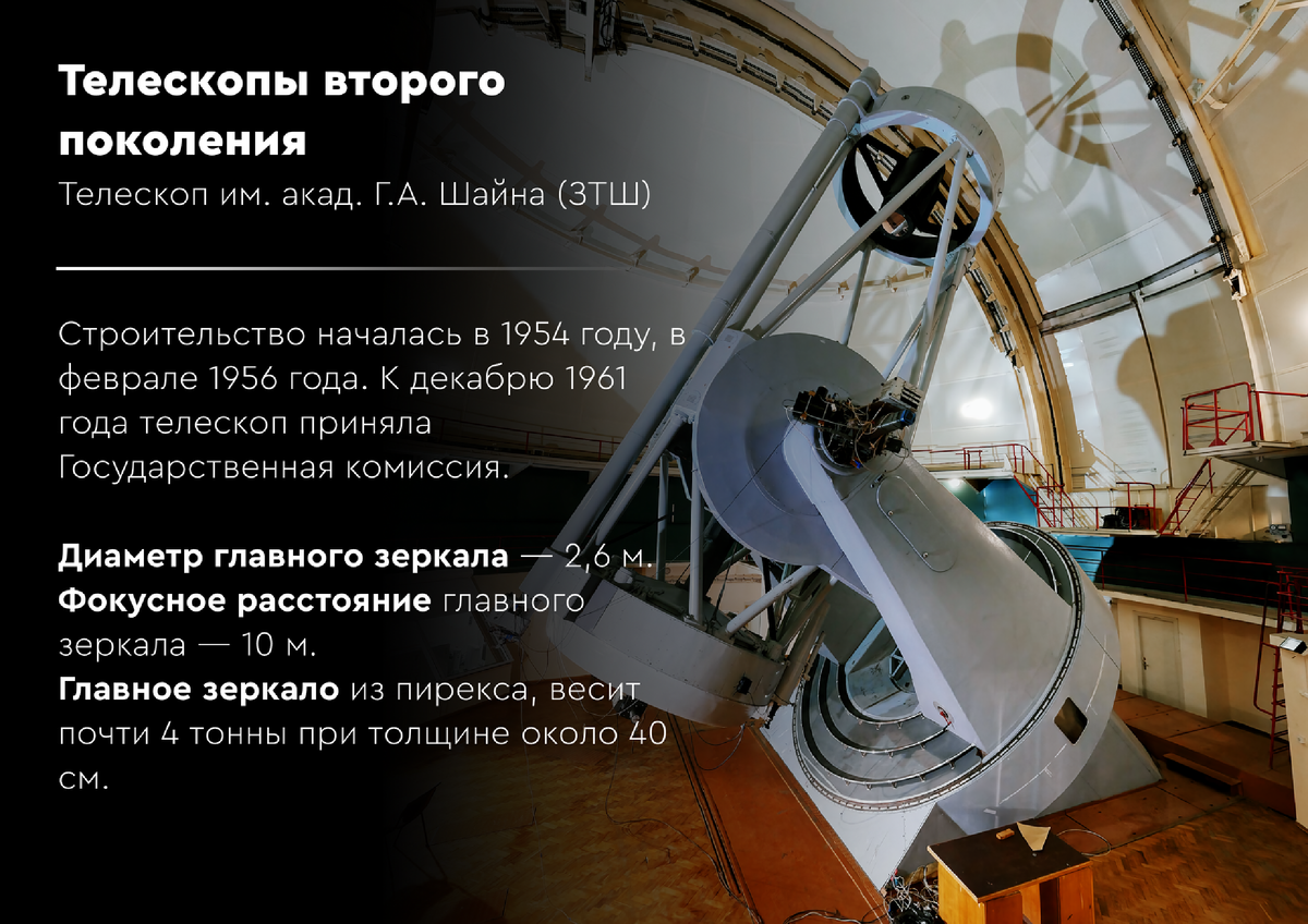 Нельзя не сказать и о советском телескопостроении. В 1930-е у нас сложилась сильная школа, были планы по созданию 81-сантиметрового рефрактора и метровых рефлекторов. Но война перечеркнула эти планы. Первая серия небольших телескопов (до метра) появилась в СССР только в 50-е. Затем построили два 2,6-метровых рефлектора — один из них, в Крымской обсерватории, телескоп им. академика Г.А. Шайна (ЗТШ) стал характерным представителем того самого второго поколения. А потом был рывок к шести метрам — БТА, но это уже совсем другая история.