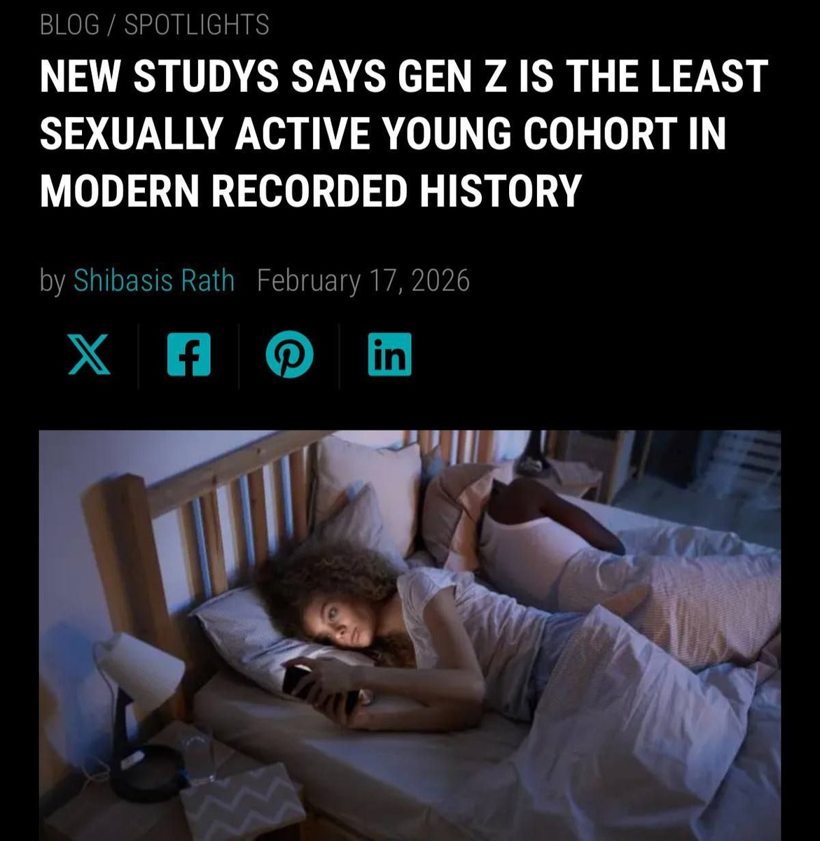 Так, лишь 37% зумеров занимаются сексом… Эксперты считают, что всему виной лёгкий доступ к порно, высокий уровень открытости разговоров о сексе, экономическая нестабильность и массовый уход в онлайн-общение. ИнфоСплетник ────────── ⚡️Важные новости – без лишнего шума!⚡️ Подпишись на канал и получай только суть: оперативно, чётко, по делу! 👉 ИнфоСплетник | @infospletnik