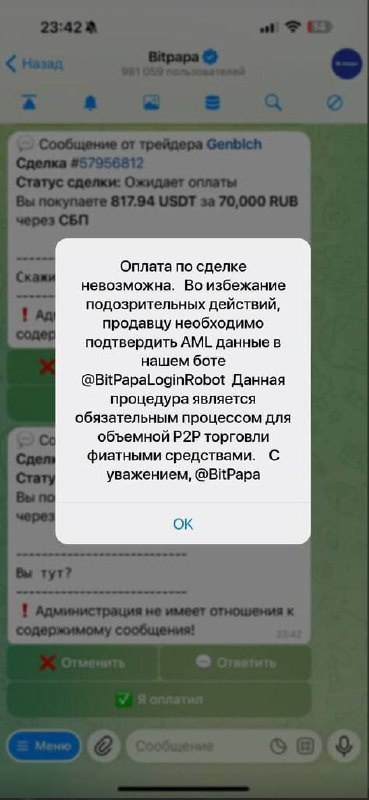 К тебе заходят в сделку, чтобы купить у тебя крипты и отправить тебе денег. Далее кидают скрин из бота, что биржа не дает завершить сделку и перевести, так как «Продавцу» (то есть тебе) - надо пройти AML-проверку в боте. И там же указан юзернейм бота. Этот скрин - рисовка. Цель - чтобы ты перешел в бота, ввел данные от своего акка и благополучно просрал доступ. Не ведись ! Все идентично, как письмо от лжесаппортов разных бирж, которые тоже просят пройти вериф в ботах. Просто эти черти придумывают новые исхищрения. Не удивлюсь, если скоро и лжескрины из приложений будут кидать, и с сайтов. Помни !! Всегда проверяй юзернейм ботов и поддержки на официальных сайтах бирж. Не поленись потратить пару минут своего времени ! Как я и говорил, есть «Костяк Скама», все остальное, это «доработки, отшлифовки, апгрейды». Будь осведомлен, и береги свои деньги !