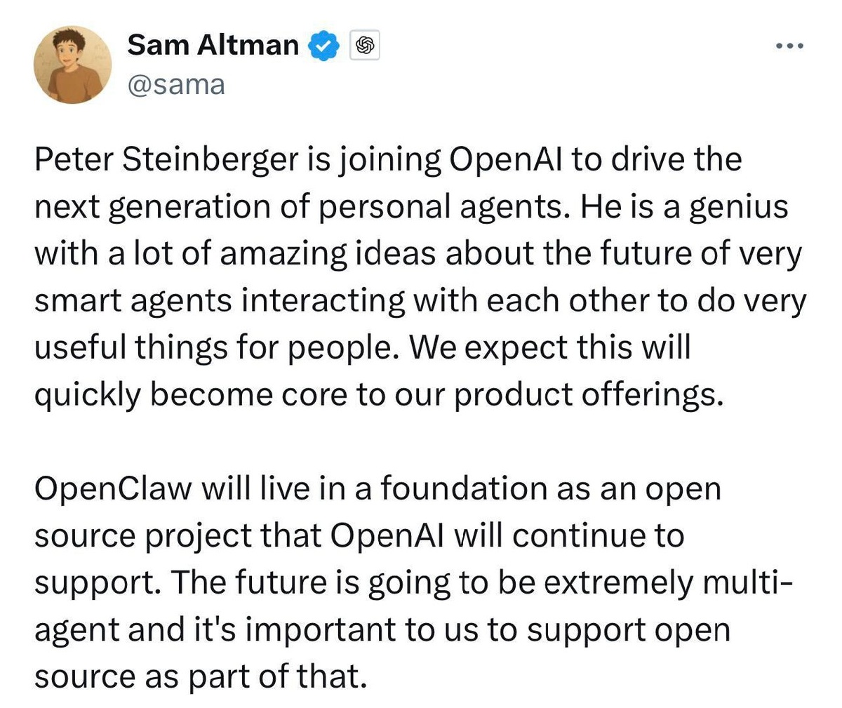 OpenAI наняли Питера Штайнбергера, создателя OpenClaw, чтобы развивать ИИ-агентов нового поколения. Проект OpenClaw останется открытым и независимым, а сам Питер сосредоточится на создании новых решений. Не успели мы толком разобраться, что за новый вышел ИИ агент, а его уже переманили, ладно хоть говорят, что OpenClaw не загубят.