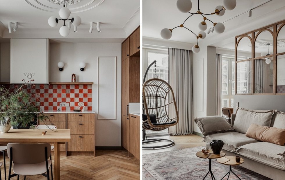 Дизайнер поставила задачу максимально органично интегрировать в интерьер образ леса и графику сосен. Цветовая палитра включает оттенки земли, коры, текстуры дерева, лесных ягод и цвета мха, создавая единое пространство. Дубовые арки перекликаются с малыми архитектурными формами парков, светильники напоминают плафоны уличных фонарей, а плитка в клетку ассоциируется с шахматными досками, используемыми для партий в городских парках. На балконе плитка уложена с рисунком, напоминающим опавшие сосновые иголки.Введите текст