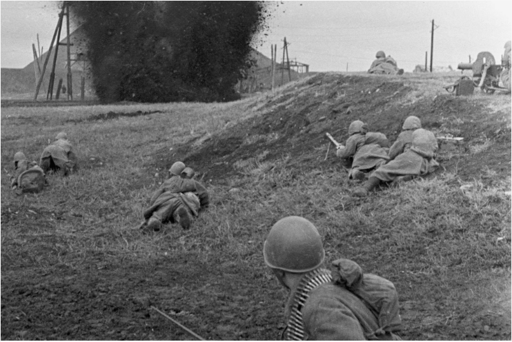 Немцы, захватив плацдарм и выбив наших, а может просто заняв деревню, дальше в лес не полезли, а выбрав удобные позиции, сразу стали окапываться. И теперь их линия обороны, походила на подкову, упираясь своими флангами в реку. Заняли они так же и господствующую над местностью высоту, находящуюся метрах в трёхстах от деревни. Наша пехота после нескольких неудачных атак, отошла к самой опушке леса, и если с фронта импровизированная оборона проходила в полукилометре от высоты, то на флангах от деревни до края леса, было всего метров триста. Судя по всему, фрицев на флангах могли поддерживать ещё и пулемёты из-за реки, так что обойти их, и ударить с тыла от берега, было нереально. При нашем наступлении хоть справа, хоть слева, наступающие цепи попадали под перекрёстный, а также фронтальный огонь. Оставалось только штурмовать в лоб высоту, после чего деревню, что в лучших традициях РККА и предприняли наши, причём днём, и естественно умылись кровью. Увидев всё, что нужно, спускаемся вниз и, надев шинели, бежим на левый фланг. Пока бежали, заодно и согрелись, так что когда добрались до места, от нас валил пар. Тут пехота даже не заморачивалась с рытьём окопов, а занимала позицию по краю оврага, разрезавшего землю вдоль опушки, и до деревни было около трёхсот метров. Грунтовка здесь проходила недалеко от берега реки, где овраг был засыпан, а для отвода воды в реку, использовались дренажные трубы.