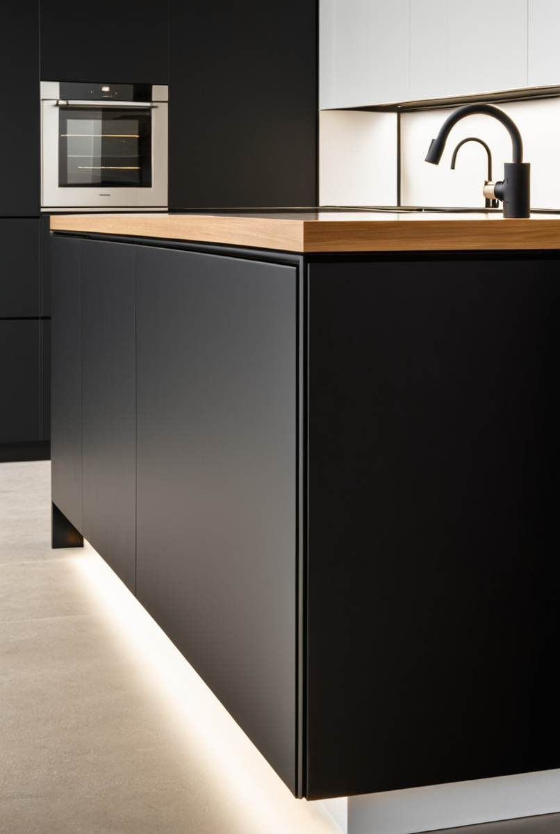 Ручка-профиль — это мебельная фурнитура, создающая лаконичный дизайн и эффект «кухня без ручек» для гладких фасадов. По способу установки профильные ручки делятся на несколько типов. Самая популярная профильная ручка — торцевая L-образная или П-образная. Её монтаж прост: осуществляется крепление на торец фасада с тыльной стороны. Более сложный вариант — врезная ручка, требующая фрезеровки паза. Накладная ручка также крепится сзади, но без врезки. Отдельно стоит система Gola-профиль: это специальная планка, которая встраивается не в фасад, а в корпус мебели, создавая зазор для захвата рукой. Такая же установка формирует идеально ровную поверхность без выступающих элементов. Интегрированная ручка является ключевым элементом, который формирует лаконичный дизайн. Ее главная задача — стать почти невидимой, раствориться в плоскости фасада, создавая монолитную поверхность. Именно поэтому она незаменима в стиле минимализм, где каждый лишний элемент нарушает гармонию. В интерьерах хай-тек такая