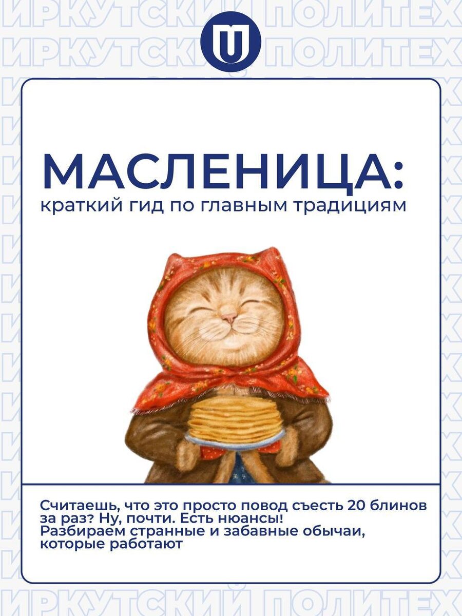 ☀️ Сегодня с 12:45 на площади перед ИРНИТУ (Лермонтова, 83) вас ждёт: 🔥 Традиционные забавы + концерт + море позитива 🥞 Блины и 🥟 буузы — вкуснятину получите, просто показав подписку на чат своей группы в МАХ! Узнайте, как на Руси встречали Масленицу, почему пекли блины, и как можно гадать на них — все в карточках 👉🏻 Ждём вас с 12:45! Приходите с друзьями, заряжайтесь теплом, участвуйте в играх и выигрывайте призы. Главное — не пропустите открытие! Первые блины испекут — депутат Государственной думы РФ Сергей Тен и генеральный консул Монголии в Иркутске Батсух Ичинхорлоо. 👻 МАХ | 💙 ВК | 📝 ДЗЕН