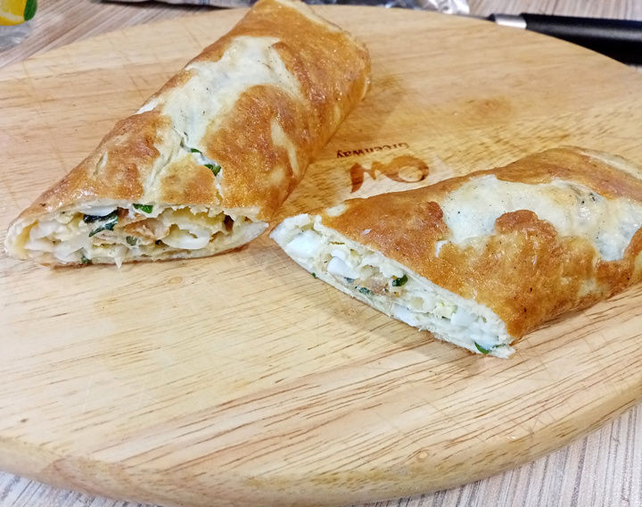 Для омлетных блинчиков: ✔ Яйца — 4 шт.. Для начинки: ✔ Сыр твердый (50% жирности) — 80 г; ✔ Яйцо вареное — 2 шт.; ✔ Зелень свежая (укроп, петрушка) —небольшой пучок; ✔ Соль, перец — по вкусу. Яйца взбиваем вилкой до однородности. Разогретую сковороду (с антипригарным покрытием) хорошо прогреваем. Выливаем половину яичной смеси и быстрым движением распределяем по дну, как обычный блин. Выпекаем с двух сторон до легкой румяности. Масло для жарки не требуется, если сковорода качественная. Затем выпекаем второй блин. Начинка: Сегодня у меня начинка такая: смешиваю тертый сыр, рубленую зелень и вареное яйцо, натертое на терке. Выкладываю начинку на край готового омлетного блинчика и сворачиваю рулетиком. Начинённый блинчик разрезаю пополам на два рулетика. КБЖУ на 100 г – 193/14,9/14,0/0,9. Рецепт на странице Перепады настроения знакомы каждому, но где заканчивается норма и начинается болезнь? Советует доктор Ксения Хромова, психиатр, психотерапевт Автор рецепта – Ася Баринова Расчёт КБЖУ