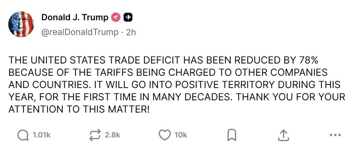 : «Торговый дефицит США сократился на 78% благодаря тарифам, взимаемым с других компаний и стран. В этом году он впервые за многие десятилетия станет положительным. Благодарим вас за внимание к этому вопросу!». Сальное Дифлопэ