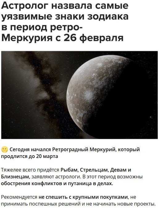 Если что - пощу это смеха ради. Православным верить во всю эту ересь не надо. Тут такое дело... Я ж думала, что тема с "ретроградным меркурием" - это прикол такой. Мем. А они ж серьёзно. 🤷🏻🤦🏻🤷🏻 ❗️ ДРУЗЬЯ ❗️ Обратите, пожалуйста, внимание, на другие мои тексты: ☑️ Прилепин предложил создать Музей преследований старообрядцев ☑️ Как магнитные бури вредят здоровью человека и что нам с этим делать? Нейросеть ответила! ☑️ Купание в сугробе ❗️