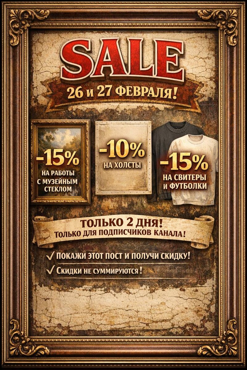 🔥 Только в четверг и пятницу — 26 и 27 февраля — специальные условия исключительно для подписчиков нашего Telegram-канала. 🎯 –15% на весь заказ при оформлении работ с музейным стеклом 🖼 –10% на оформление холстов 👕 –15% на оформление свитеров и футболок Условия простые: ✔️ Покажите этот пост при оформлении заказа ✔️ Скидки действуют только 2 дня — 26 и 27 февраля ✔️ Только для подписчиков канала ✔️ Скидки не суммируются Это отличная возможность оформить картины, графику и текстиль с максимальной выгодой. Такие предложения бывают редко — не упустите 👌 ⸻ Арт-мастерская Багетъ — Искусство в каждой детали. 🕰️ 🎯 КОНТАКТЫ: 📍 Москва, Дмитровский пер., 4, стр. 1 🚗 Бесплатная парковка во дворе 🚇 5 мин от м. Театральная / Кузнецкий Мост / Охотный Ряд 📞 +7 499 110-12-49 🌐 bagetnayamasterskaya.com