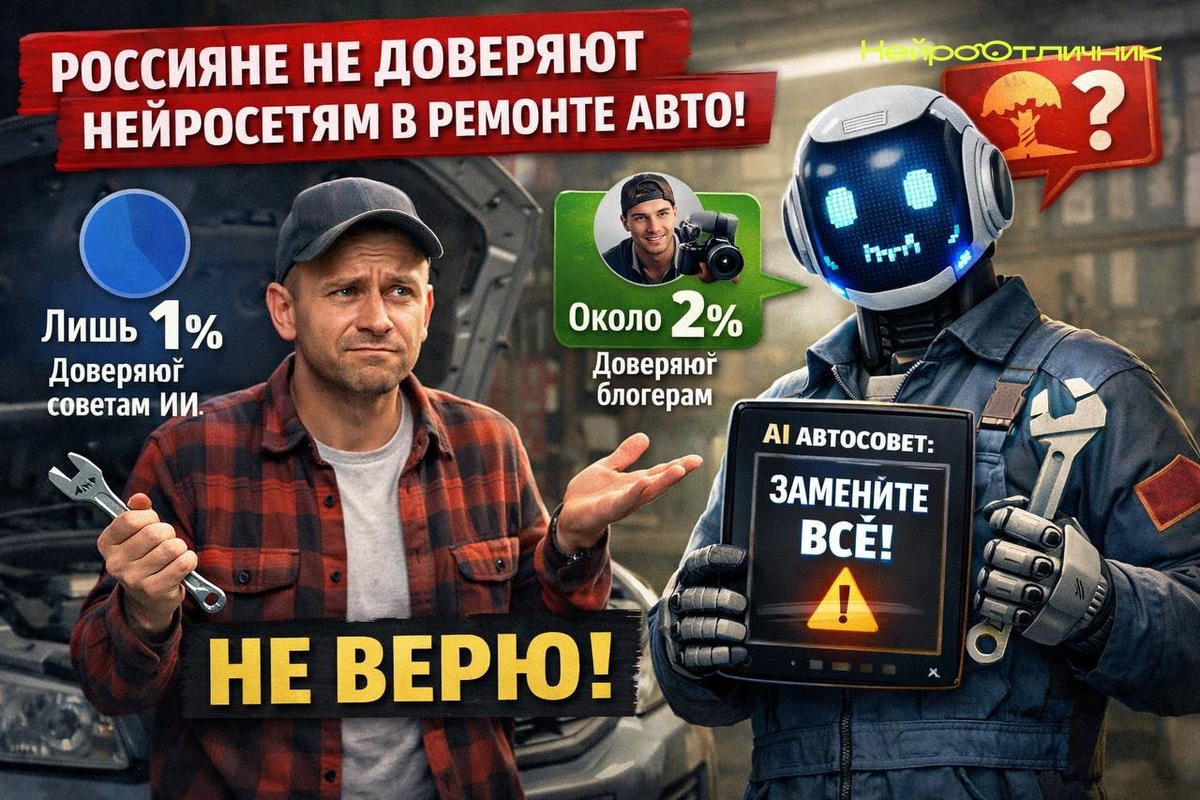 Всего 1% российских автолюбителей считают советы нейросетей по ремонту полезными. Блогерам доверяют чуть больше — 2%. При этом 40% активно используют ИИ для работы каждый день. Выходит, искусственный интеллект востребован, но только там, где не рискуешь техникой и безопасностью. В ремонте же большинство предпочитает опыт мастера, а не цифрового помощника. Пока автосервисы остаются вне конкуренции — ИИ доверяют больше для рутинных задач, а не для сложных поломок. А вы доверили бы ремонт машины искусственному интеллекту? Подписывайтесь! #технологии #искусственныйинтеллект #авто #россия Нейро Отличник www.neurootlichnik.ru