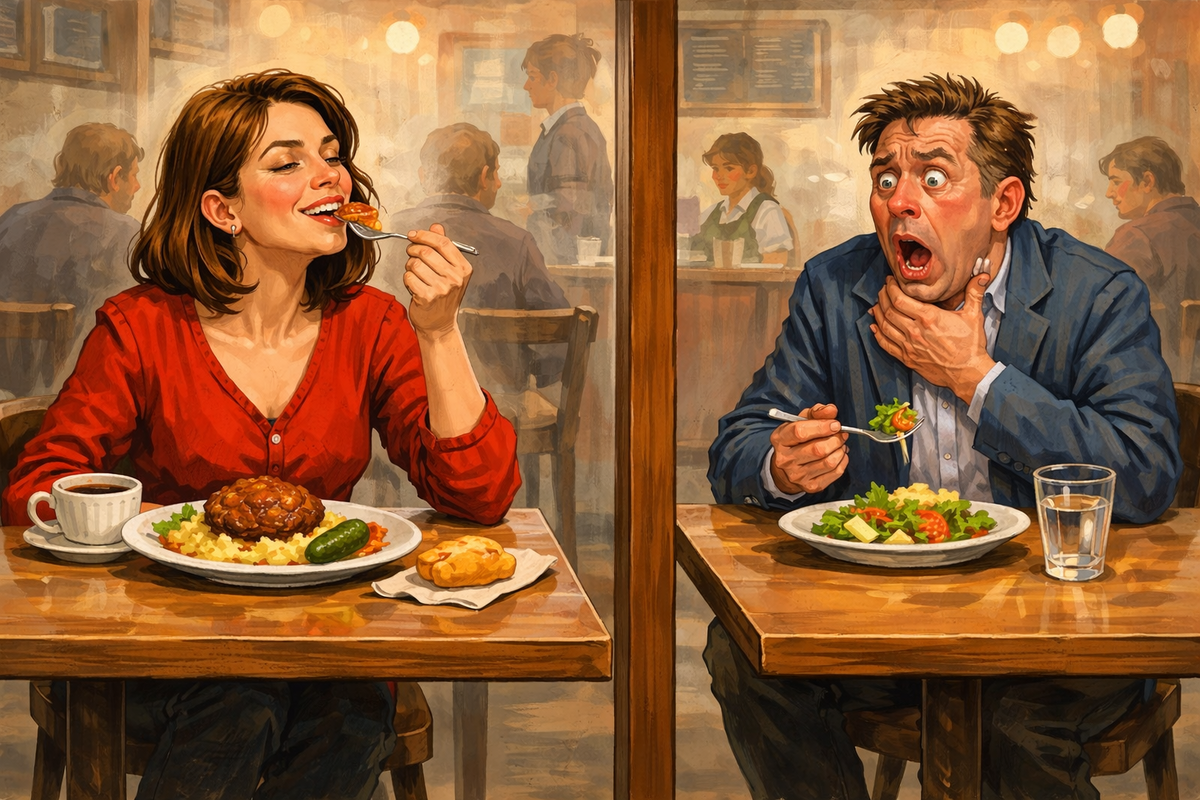 Это был час пик, время, когда честные труженики, подобно стаду бизонов, мигрируют от мест своей трудовой повинности к местам кормления. В одном из таких заведений, уютно примостившемся у подножия делового небоскрёба, за столиком у окна сидела молодая особа. Как её звали для нашего повествования не столь важно, ибо в этот момент она была не просто девушка, а голодным волком в юбке. Обед выдался на славу. Время поджимало, стрелки часов бежали быстрее, чем официанты в этом кафе, поэтому девушка ела с той сосредоточенной страстью, с какой скульптор отсекает лишнее от глыбы мрамора. Только в данном случае глыбой был ростбиф с картофельным пюре, а скульптором — её неукротимый аппетит. Это голодное желание было настолько явным и неподдельным, что вызывало невольное уважение у всех, кто наблюдал за процессом. Всех, кроме одного. За соседним столиком восседал субъект, чья внешность явно свидетельствовала о том, что он давно и безнадёжно влюблён в собственную персону. Он ковырял вилкой лист сал
