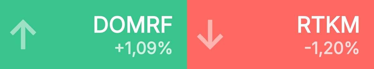 : Дом.РФ • 2 294 ₽ • 1,09% ГК Самолет • 879 ₽ • 0,92% ЮМГ • 878 ₽ • 0,71% Сегежа • 1,31 ₽ • 0,65% Банк Санкт • 341 ₽ • 0,64% ВИ.ру • 80,06 ₽ • 0,64% Астра • 265 ₽ • 0,61% Совкомбанк • 13,98 ₽ • 0,61% ЭЛ5-Энерго • 0,51 ₽ • 0,52% Аэрофлот • 56,03 ₽ • 0,50% 🔻 Топ-10 лидеров падения среди крупнейших акций: Ростелеком • 65,14 ₽ • -1,20% Ростелеком • 62,55 ₽ • -1,18% ММК • 31,72 ₽ • -1,15% ТГК-1 • 0,01 ₽ • -0,79% Эн+ • 480 ₽ • -0,59% Полюс • 2 497 ₽ • -0,58% Ренессанс • 95,36 ₽ • -0,52% Норильский • 160 ₽ • -0,46% РусГидро • 0,44 ₽ • -0,40% Совкомфлот • 75,80 ₽ • -0,39%