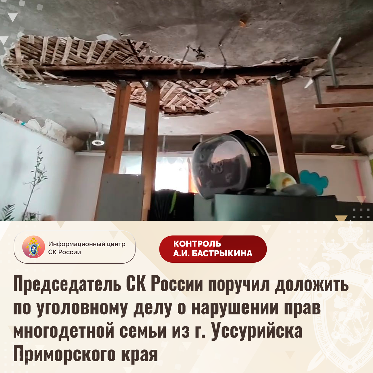 Председатель СК России поручил доложить по уголовному делу о нарушении прав многодетной семьи из г. Уссурийска Приморского края В сети Интернет сообщается о нарушении прав многодетной семьи из города Уссурийска Приморского края. Мать с шестью детьми проживает в многоквартирном доме 1953 года постройки на улице Блюхера, который длительное время находится в непригодном для проживания состоянии: из-за неисправности электропроводки в нем произошел пожар, что привело к обрушению в квартире потолочных перекрытий. Для предотвращения дальнейших разрушений в помещении установлены подпорные балки. В 2025 году строение ввиду высокой степени физического износа конструкций признано аварийным, однако сроки расселения установлены лишь на 2033 год, при этом мер к предоставлению семье благоустроенного жилья взамен не принимается. Обращения женщины в различные инстанции результатов не принесли. В СУ СК России по Приморскому краю возбуждено уголовное дело. Председатель Следственного комитета Российской