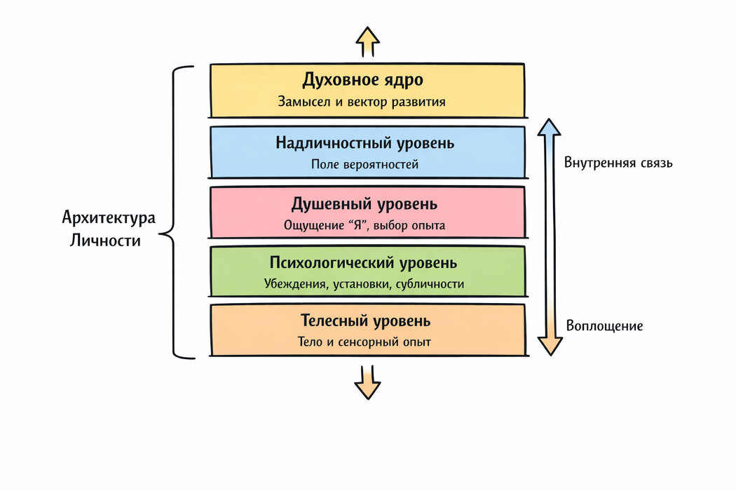 Если посмотреть глубже, личность не исчерпывается психикой. Она является многоуровневой структурой, в которой земное сознание представляет собой лишь один из слоев.