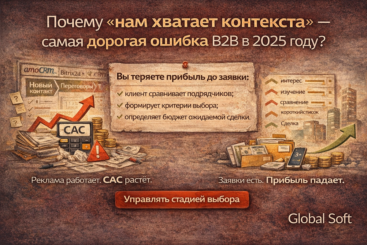 В B2B с высоким чеком (от 20–30 тыс. ₽ и выше) зависимость только от контекстной рекламы и классической лидогенерации почти всегда приводит к росту CAC (стоимости привлечения клиента). Если заявки фиксируются в CRM (amoCRM, Bitrix24 и др.), CPL считается, отчёты выглядят «стабильно», но при этом: — цикл сделки удлиняется,