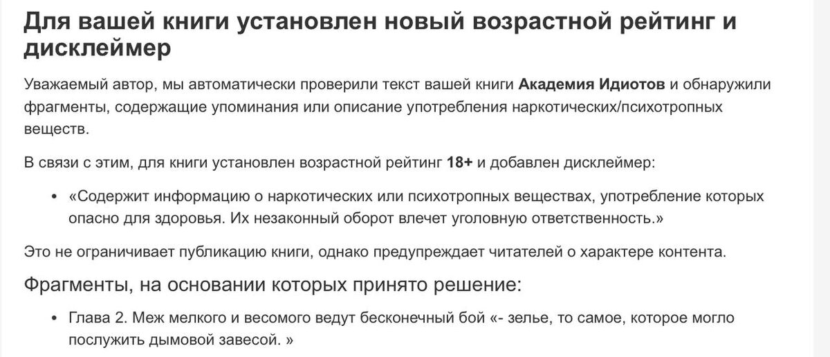 +. Они подключили бот, выискивающий все наркотики в книгах. Вот только он выискивает не только наркотики😅 И с учетом, что проверены будут ВСЕ книги, исправят они не скоро. На данный момент уже почти все мои книги Литнет сделал 18+… В общем-то я понимаю, почему литнет так сделали. Сидеть не хочется-то. Но все же как-то очень топорно, конечно.