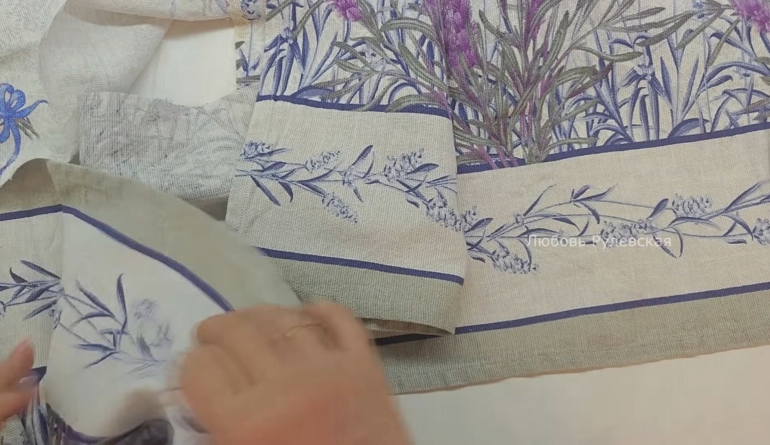 Да, это старая скатерть для журнального столика. Да, на ней были пятна. Но на ней были и совершенно чудесные фрагменты в стиле прованс — лаванда, нежный рисунок, настроение. И именно из них сегодня родится вещь, которая будет радовать глаз — аккуратная косметичка на скрытом фермуаре.