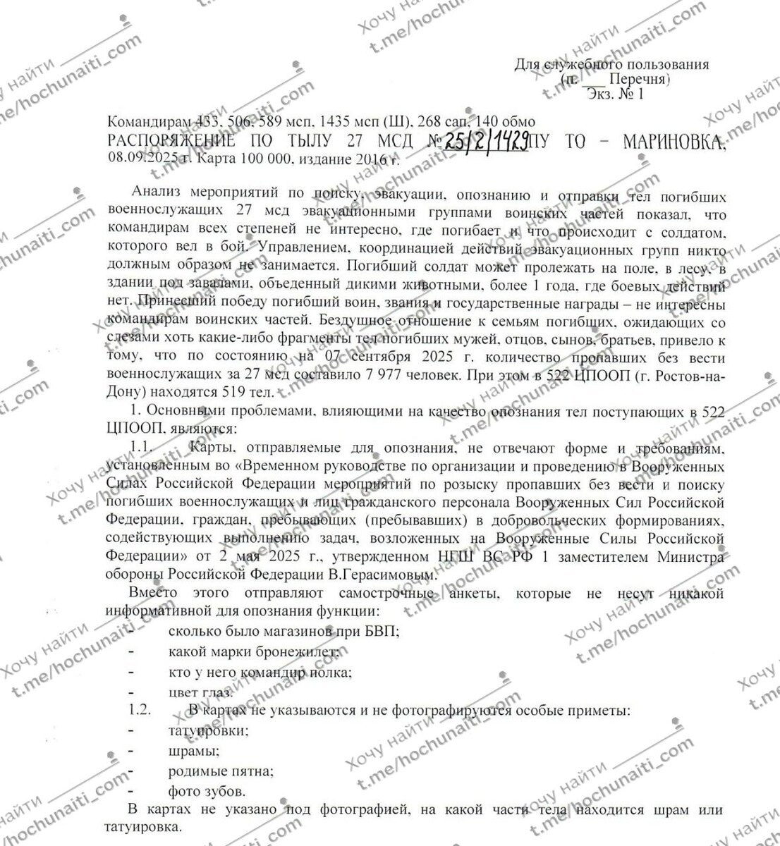 Тема пропавших без вести на СВО военнослужащих в последние годы звучит все чаще. За сухими формулировками — судьбы конкретных людей, неопределенность для их близких и сложные юридические последствия. Когда количество таких случаев исчисляется тысячами, речь идет уже не о частных трагедиях, а о системной проблеме. Масштаб и управленческий контекст По состоянию на 7 сентября 2025 года, согласно внутреннему распоряжению временно исполняющего обязанности начальника штаба — заместителя командира 27-й мотострелковой дивизии, число пропавших без вести в соединении составило 7 977 человек. При этом в 522-м Центре приема, обработки и отправки погибших находятся 519 тел. Документ, направленный командирам полков, фиксирует критическое состояние работы эвакуационных групп и системы учета погибших. В нем указывается на отсутствие должной координации и управления, что приводит к длительному нахождению тел на местах боевых действий — иногда в течение многих месяцев, а в отдельных случаях и более года