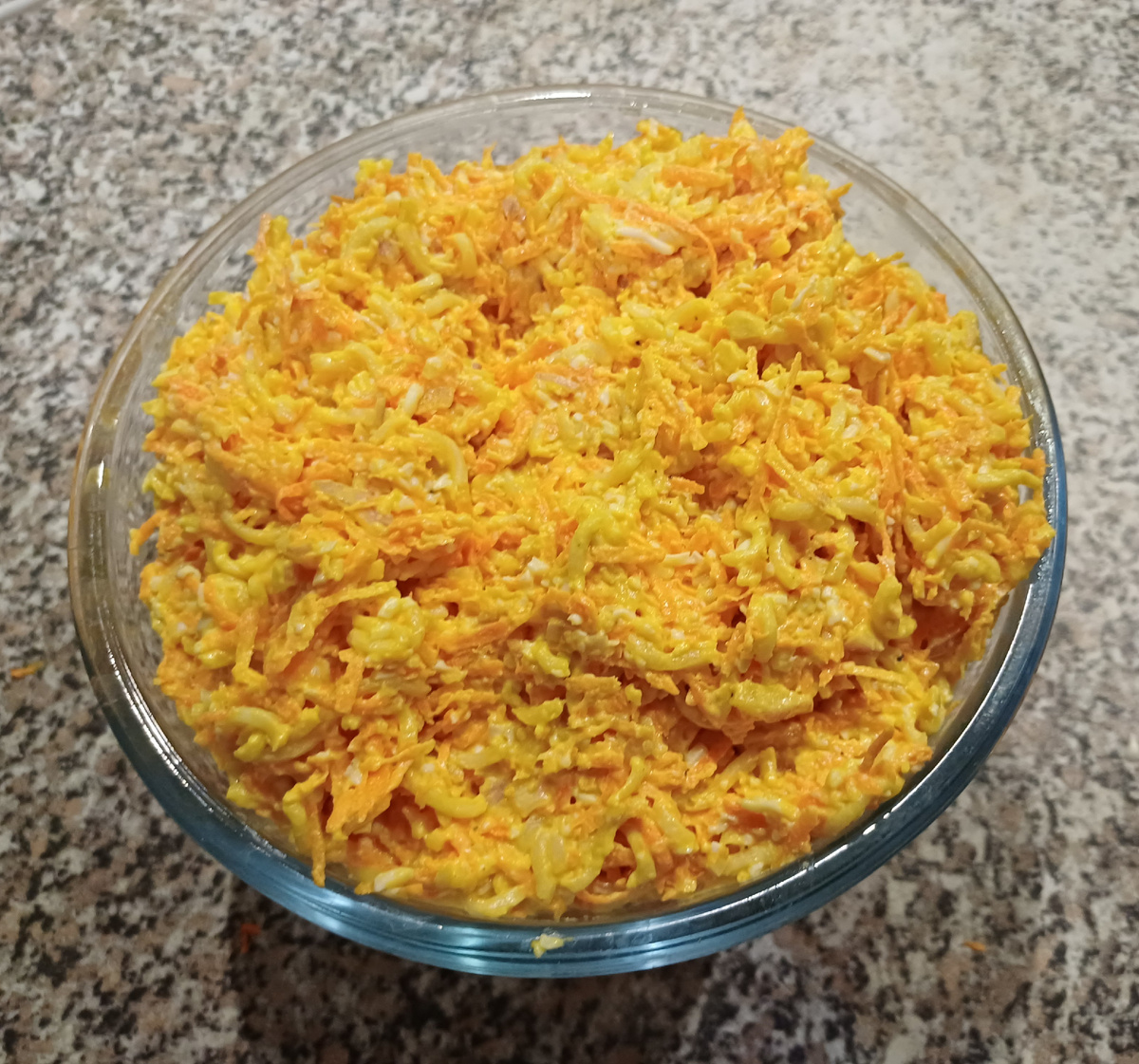 2 упаковки вермишели "Ролтон", 5 вареных яиц, 3-4 крупные моркови(свежие), 2 -3 средние головки лука, соль, черный молотый перец, майонез по вкусу.