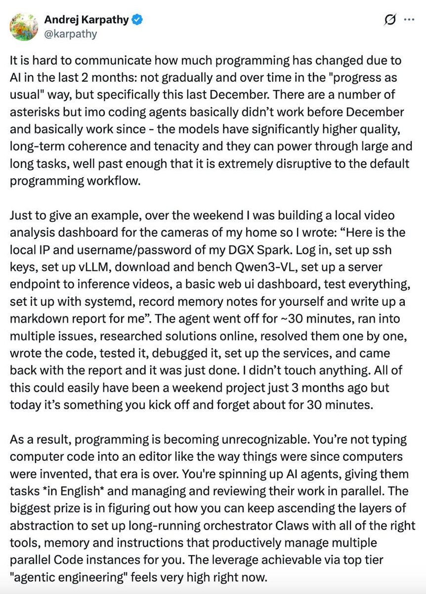 За последние пару месяцев программирование изменилось не постепенно, а резко. Раньше кодинг-агенты выглядели как интересный эксперимент - могли помочь с фрагментами кода, но не тянули реальные задачи. Сейчас ситуация другая: модели научились держать контекст, последовательно решать проблемы и доводить работу до конца. По сути, они получили главное качество инженера - упорство. Типичный сценарий сегодня выглядит так: ты ставишь задачу высокого уровня, агент подключается к серверу, настраивает окружение, устанавливает зависимости, поднимает сервисы, пишет код, тестирует, исправляет ошибки и возвращается с готовым результатом и отчётом. То, что раньше занимало выходные, теперь может решаться за десятки минут автономной работы. И это меняет сам подход к разработке. Раньше основной навык был - писать код. Теперь основной навык - формулировать задачи, декомпозировать их и управлять процессом. Новый рабочий процесс: * описываешь цель на естественном языке * запускаешь агента * наблюдаеш