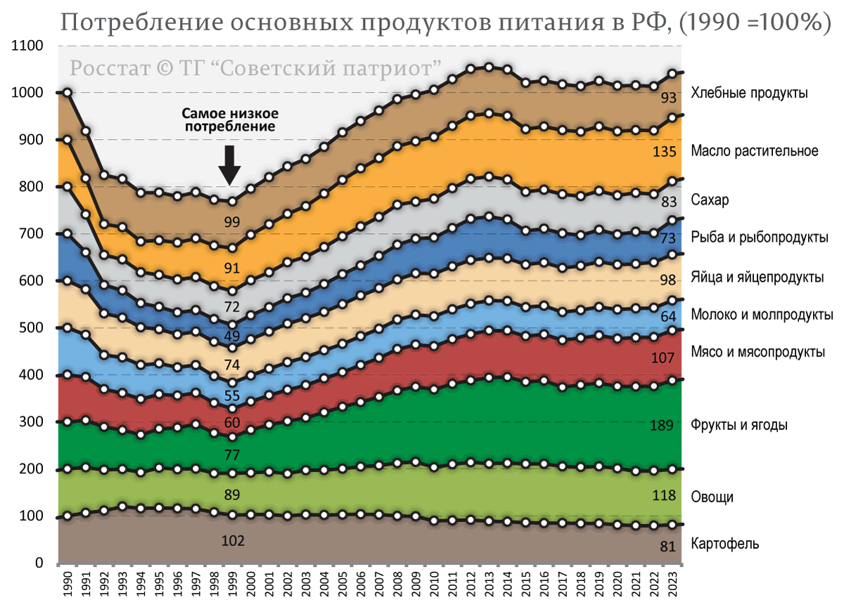 Высокому начальству до сих пор не дает покоя СССР. Так глава российского буржуинского парламента и бывший пальмовой король Володин зачем-то в очередной раз помянул плохим словом нашу советскую Родину: МОСКВА, 25 февраля. /ТАСС/. Советский союз не был способен накормить свое население, Россия же смогла преодолеть продовольственный кризис 80-х годов прошлого века, заявил в ходе отчета правительства в Госдуме председатель палаты парламента Вячеслав Володин. Вообще-то, если судить строго по фактам, причем официальным -- российского статистического ведомства, то самое худшее положение с продуктами питания в нашей стране было не в позднесоветские времена (из-за рукотворного кризиса со снабжением), а в конце 90-х годов: При этом позднесоветский уровень потребления продуктов, содержащих животные белки и жиры (мяса, рыбы, молока и яиц) не достигнут до сих пор. В связи с этим я могут только посоветовать высокому начальству, что если оно в следующий раз захочет похвастаться своими достижениями, т