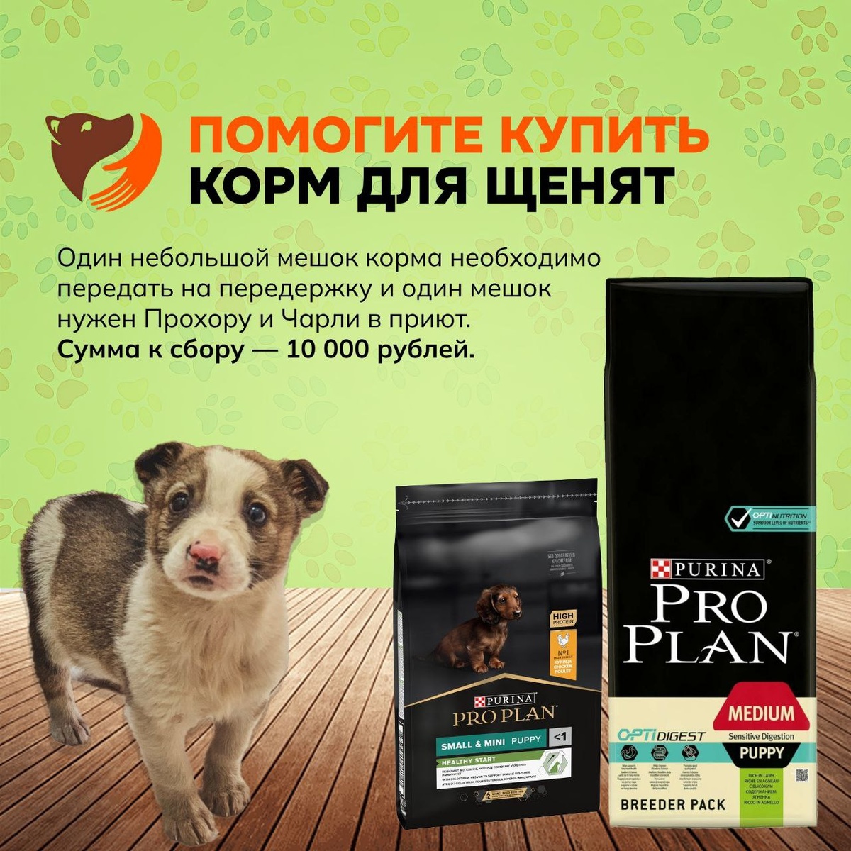 Для щенков необходимо купить специальный мелкий корм.Один мешок в приют для Чарли и Прохора и небольшой мешок на передержку куда поедет