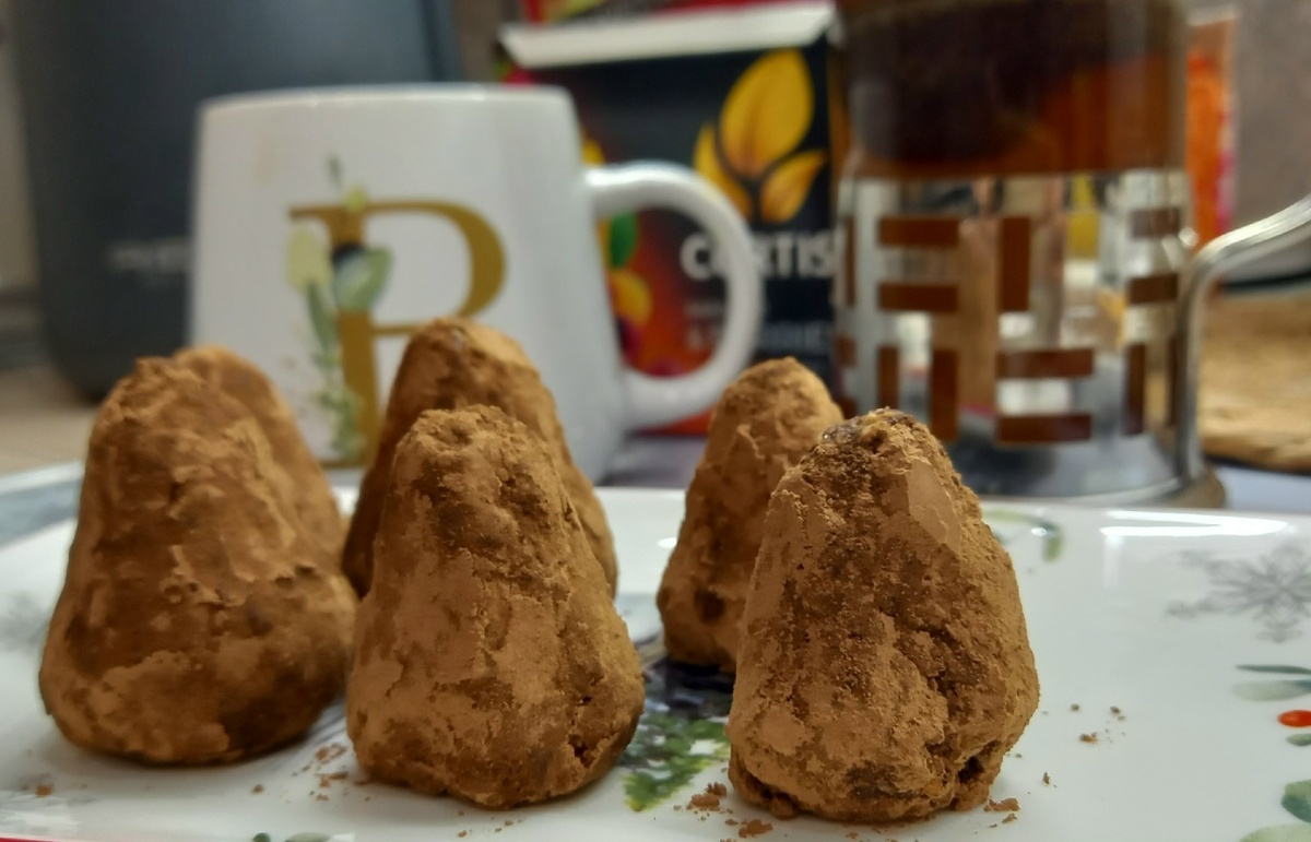 2 ч\л какао (несладкого) + ложка для обсыпки Для измельчения семечек берем блендер. Я пробиваю семена не до состояния халвы, оставляю семечки как дробленые орешки Очень хорошо, если поэкспериментировать с составляющими: например взять 70гр семечек и 30 гр грецких орехов. Но это уже по желанию Итак, эту массу соединяем с какао и медом. Получаем рассыпчатое, непослушное тесто, из которого руками формируем конусообразные конфеты. Если хотите более мягкую текстуру трюфеля добавьте еще одну ложечку меда. Готовые конфетки обваливаем в какао и даем настояться, чтобы конфетка полностью пропиталась. Итак, трюфели к чаю готовы. Из указанных ингредиентов получается 6 маленьких штучек, которые тут же исчезают с тарелки;) Всем приятных посиделок и легкого поста!\