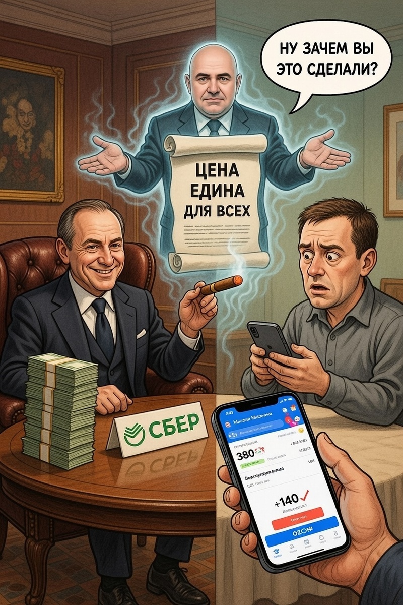 Представьте: вы заходите на Ozon, видите классный товар за 1000 рублей, добавляете в корзину, а при оплате выясняется — это цена только для карты Ozon. У вас карта Сбера — платите 1100. Бесит? Ещё как. И вот Михаил Мишустин решил это прекратить. Теперь цена должна быть одинаковой для всех независимо от способа оплаты . Вроде бы справедливо. Вроде бы забота о людях. Но вопрос: а чего это премьер-министр полез в наши скидки? Если по-простому: раньше маркетплейсы договаривались с банками и давали скидки своим клиентам. Ozon дружил со своим банком — у вас карта Ozon? Получите -10%. У вас карта Тинька? Извините, платите полную цену. Теперь это запретят. Цена на витрине должна быть конечной и одинаковой для всех. Никаких «специальных условий» при оплате конкретной картой . Звучит честно. Но давайте посмотрим, кто стоял за этим решением. А просили это... банки. Обычные банки, у которых нет своих маркетплейсов . Представьте: Сбер смотрит, как люди уходят платить картами Ozon или Wildberries, п