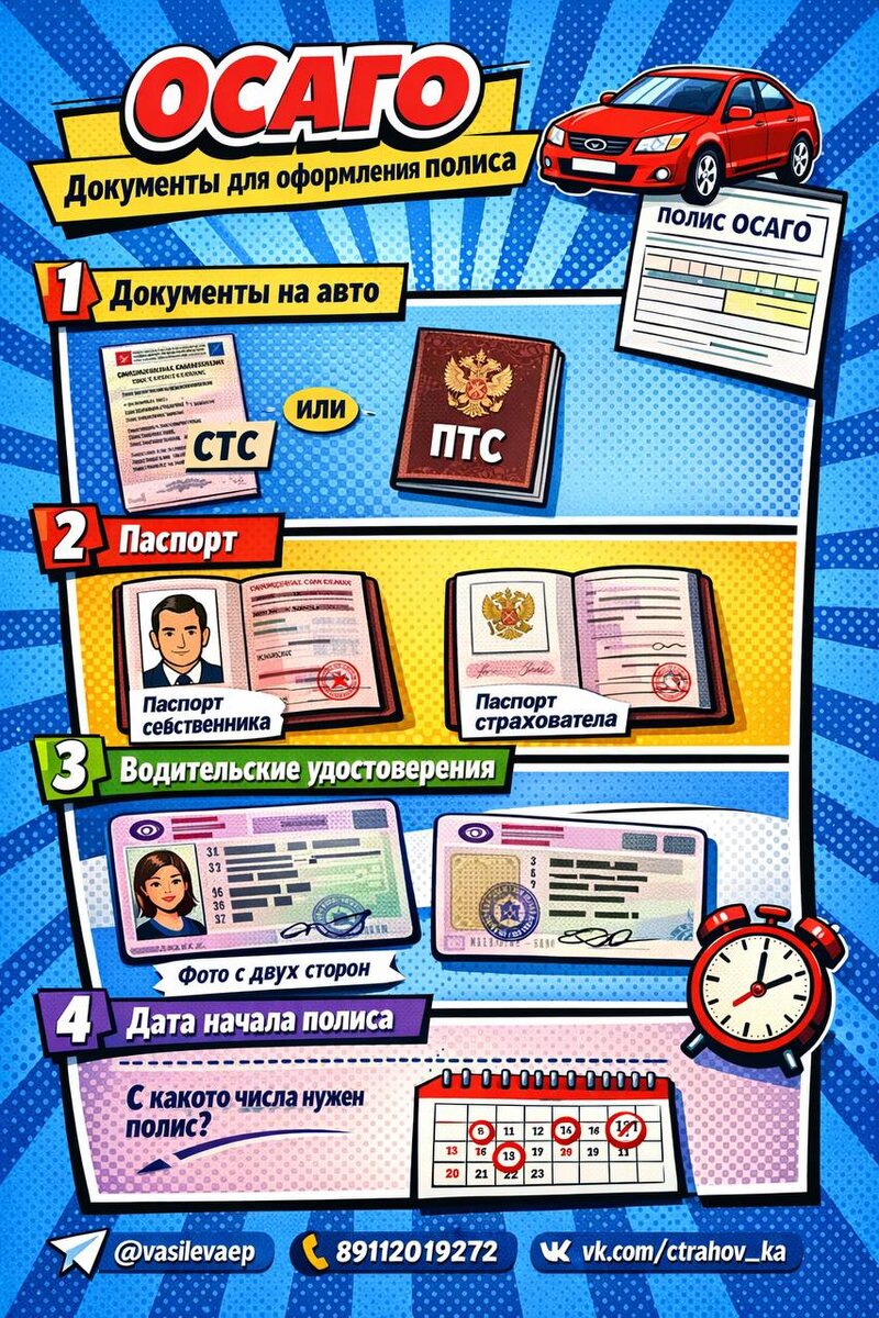 ? На этой неделе разбираем 📂 какие документы и информация нужны для расчета полисов. И начинаем с самого популярного — ОСАГО 🚘 Чтобы я могла быстро сделать расчет и оформить полис, подготовьте: 📌 1. Документы на автомобиль СТС (свидетельство о регистрации), если машина уже стоит на учете Если авто только купили — нужен ПТС (паспорт транспортного средства) 📌 2. Паспорт Паспорт собственника (разворот с фото + прописка) Если страхователь — другое лицо, его паспорт тоже потребуется 📌 3. Водительские удостоверения Права всех, кто будет вписан в полис (Фото с двух сторон) 📌 4. Дата начала полиса С какого числа нужен ОСАГО 📅 (Важно, чтобы не было перерыва в страховании) 💬 Присылаете документы — я делаю расчет, подбираю лучшее предложение и оформляем полис быстро и без лишней суеты. 📲 Telegram: @vasilevaep 📞 Телефон: 89112019272 VK: https://vk.com/ctrahov_ka Telegram-сообщество: https://dzen.ru/id/677d132563b01e74f3e6f462 МАХ https://max.ru/id510703111554_biz Страховани
