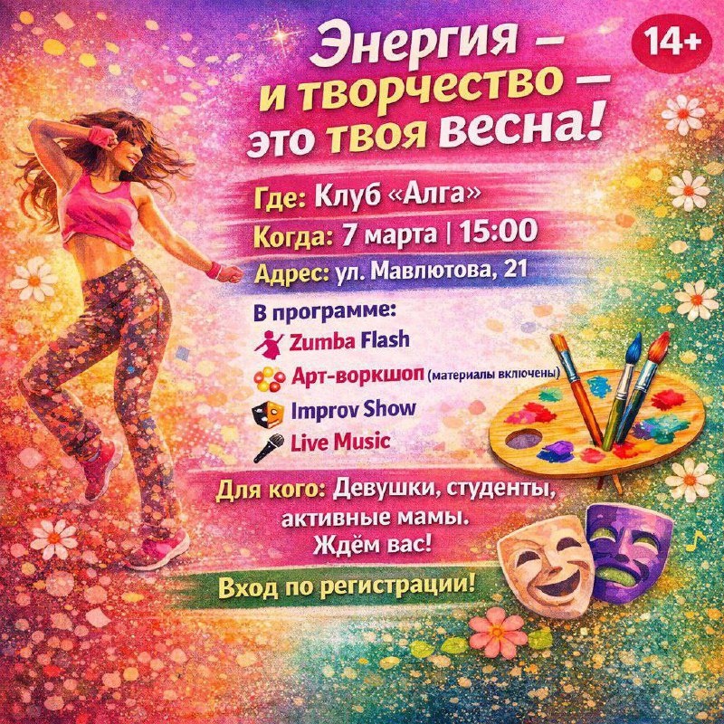 Что будет: 🔸Музыкальные выступления 🔸Творческие мастер-классы 🔸Танцевальные активности 7 марта 15:00 ✔️бесплатно по регистрации ☎️ 598-04-76 📍подростковый клуб Алга, Мавлютова 21, Казань 😹 Куда пойти с детьми в Казани @kidsafisha Больше информации в нашей группе, переходите