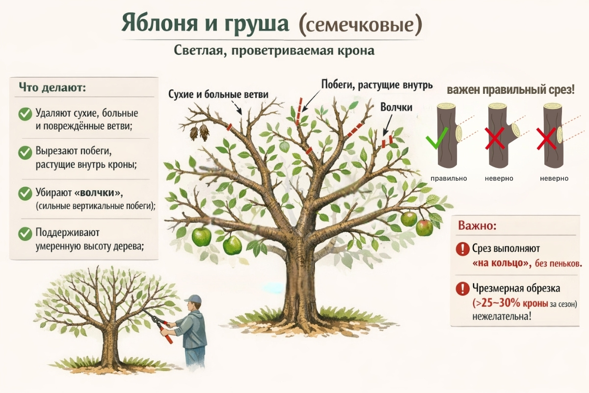 Весенняя обрезка проводится в период покоя до активного сокодвижения и распускания почек. Главная цель здоровье растения, правильная форма кроны и стабильное плодоношение. Когда обрезать Очередность обычно такая: Плодовые деревья Яблоня и груша (семечковые) Цель светлая, проветриваемая крона. Что делают: Важно: Вишня, слива, черешня (косточковые) Косточковые чувствительнее к обрезке. Рекомендации: Сильная обрезка может стимулировать камедетечение и ослабление растения, поэтому её проводят аккуратно. Чёрная смородина Плодоносит преимущественно на приростах прошлого года. Весной: Кончики побегов обычно не укорачивают без необходимости. Красная и белая смородина Плодоносят дольше — до 6–8 лет на ветви. Удаляют: Обрезка более щадящая, чем у чёрной смородины. Крыжовник Просыпается рано, поэтому обрезают как можно раньше. Удаляют: Формируют куст из 15–20 ветвей разного возраста. Малина (обычная, летняя) Побеги живут два года. Весной: Ежевика Принцип аналогичен малине: Общие правила 🚚 Отправ