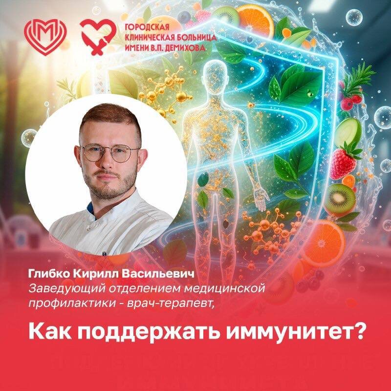 🗓С 23 февраля по 1 марта в России проходит ежегодная Неделя поддержания и укрепления иммунитета, приуроченная ко Всемирному дню иммунитета. Важность этой темы мы обсудили с заведующим отделением медицинской профилактики — врачом-терапевтом Кириллом Глибко. ❗️Иммунная система - сложная система защиты организма, отражающая атаки патогенных микроорганизмов и аномальных клеток. Эффективность ее функционирования определяется не только генетическими факторами, но и множеством аспектов повседневной жизни: правильным сном, полноценным питанием, регулярной физической активностью и эмоциональным равновесием. 💉Вакцинация признана одним из наиболее эффективных методов предотвращения заболеваний. Научные исследования подтверждают высокую эффективность вакцин в снижении заболеваемости и тяжести течения инфекций. ☑️Ключевые факторы, способствующие укреплению иммунитета: 🔴сон продолжительностью 7–9 часов; 🔴своевременная вакцинация согласно Национальному календарю прививок; 🔴физическая активнос
