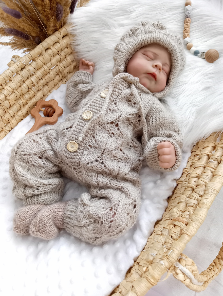 Комбинезон связан из нежной, гипоаллергенной пряжи, которая не раздражает кожу малыша. Текстура выглядит очень уютной — идеально для чувствительной кожи новорождённых.