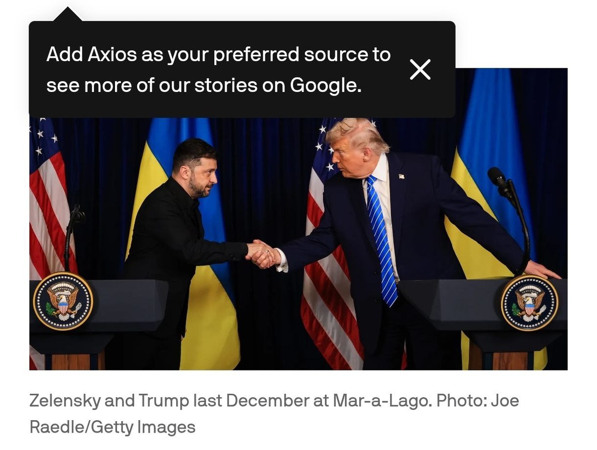 Издание Axios сообщает, что Трамп сегодня заявил Зеленскому, что рассчитывает на завершение войны в течение месяца