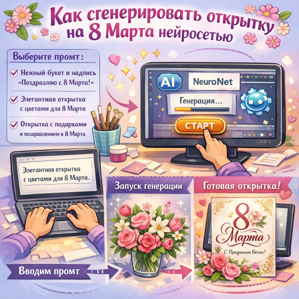 Как сгенерировать открытку на 8 Марта нейросетью. Готовые промты и нейрсоети