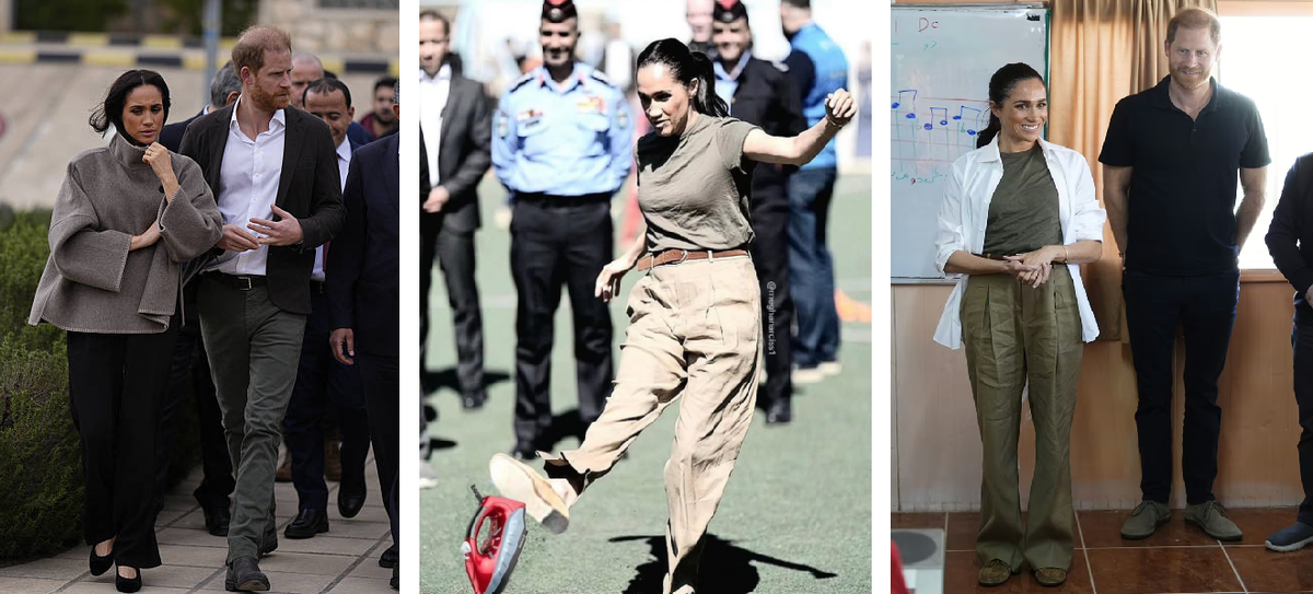 Британские СМИ наконец начали открыто критиковать Меган Маркл за ее нелюбовь к утюгу и отпаривателю. И если газета Дэйли Мэйл лишь слегка проехалась по внешнему виду Меган Маркл во время вчерашнего посещения молодежного центра QuestScope в лагере беженцев Заатари (Иордания), где она "сыграла" в футбол, отметив, что герцогине, вероятно, некогда заботиться о презентабельности своего наряда - она занята в Иордании гуманитарной миссией, то Дейли Экспресс процитировала высказывания комментаторов из соцсетей (весьма резкие) и сделала вывод: "Меган Маркл прозвали "герцогиней в мятых штанах" после "неопрятного" появления в Иордании. В первый день поездки в Иорданию все внимание было приковано к мятой одежде Меган Маркл. Меган Маркл подверглась жестокой критике со стороны поклонников за мятую одежду во время своего двухдневного визита в Иорданию. Герцогиня Сассекская вместе со своим мужем, принцем Гарри, совершила неожиданный двухдневный визит в эту ближневосточную страну. Цель визита Гарр