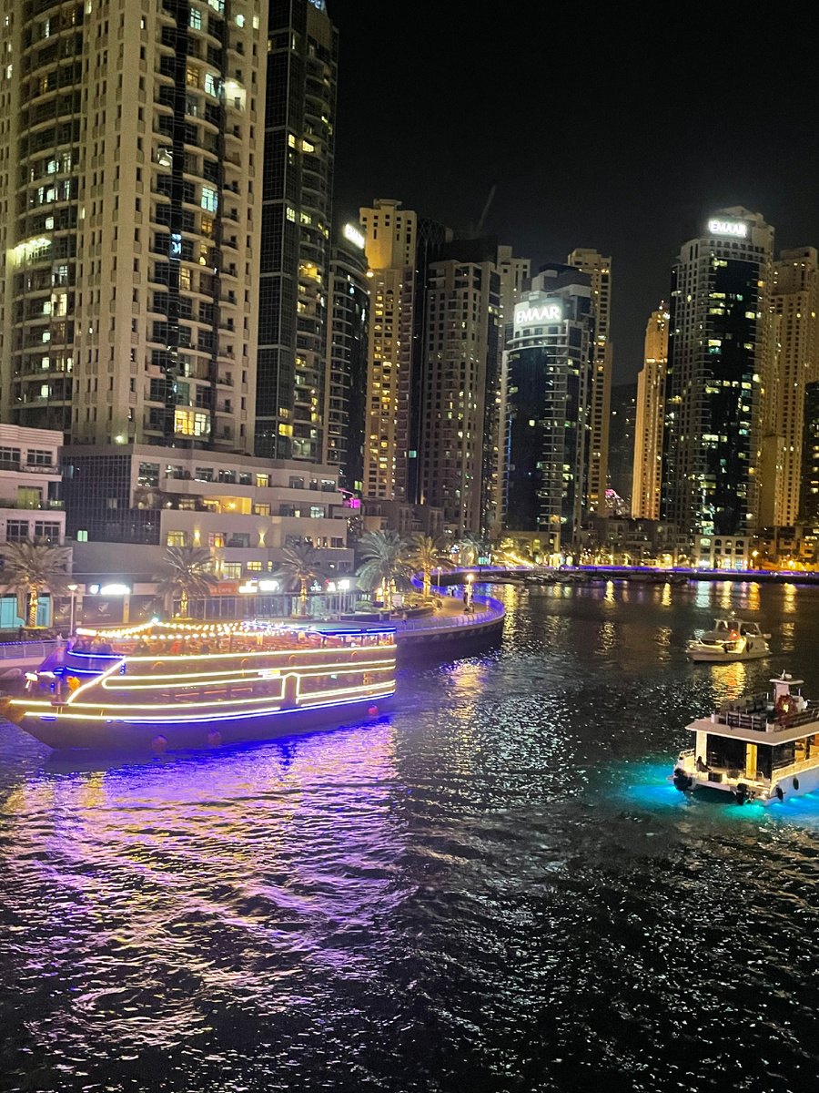 Лодка пройдёт мимо одного из самых фешенебельных районов города - Дубай Марины, самого большого в мире колеса обозрения Айн Дубай и набережной JBR - самого популярного жилого комплекса города.