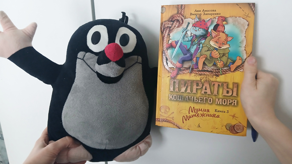 В моей семье аж четыре мужичка: муж и три сына. С самого утра устроила им квест по поиску подарков. Квест купила уже готовый, попался довольно сложный и интересный, моим понравился. Нашли свои подарки. Мужу джинсы, старшим детям по книге и умную колонку одну на двоих. А малышу любимого книжного и мультяшного героя Кротика и столовые приборы с любимым Молнией Маккуином.