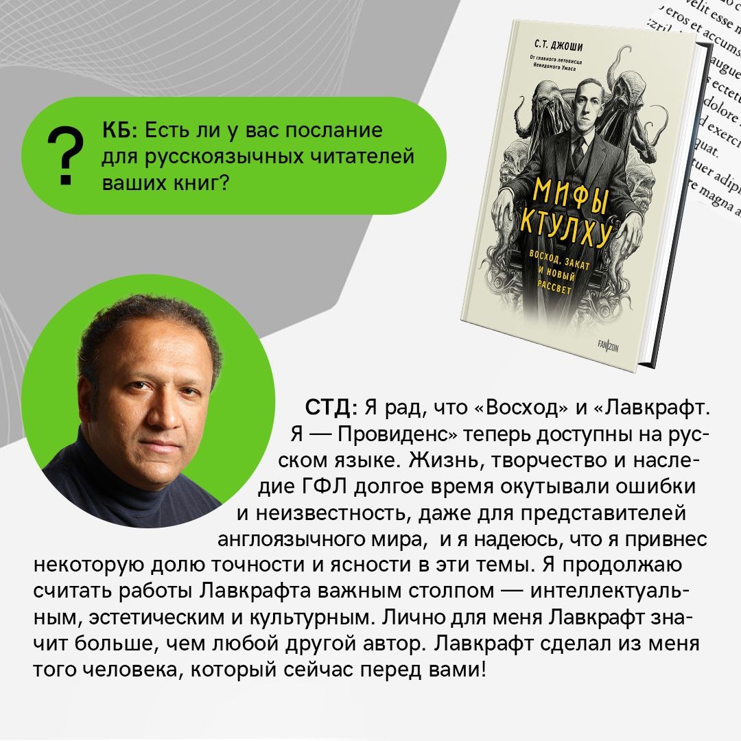 Восход, закат и новый рассвет» С. Т. Джоши. Приводим его послание для читателей из интервью с Кириллом Батыгиным. Полное интервью С. Т. Джоши можно прочесть здесь. «Мифы Ктулху. Восход, закат и новый рассвет»: Эксмо | Читай-город | Ozon | Wildberries | Литрес