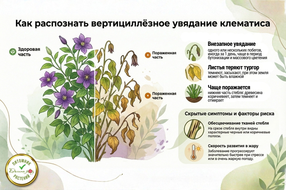 Вилт (англ. wilt — «вянуть») — это группа серьёзных болезней, при которых растение теряет способность транспортировать воду и питательные вещества по сосудистой системе, что приводит к увяданию листьев, прекращению роста и зачастую гибели клематиса. Общий термин «вилт» обозначает несколько видов возбудителей, но ключевыми из них для садоводства являются грибковые патогены. Что вызывает вилт у растений Термин ВИЛТ включает несколько грибковых заболеваний, главными из которых являются: 🔹 Вертициллёзное увядание Вызывается грибами Verticillium dahliae и V. albo-atrum почвенными патогенами, которые проникают в корни растений и затем заселяют проводящие ткани. Это приводит к препятствию движения воды вверх по стеблю, что приводит к увяданию и отмиранию побегов. 🔹 Фузариозное увядание Гриб Fusarium oxysporum вызывает фузариоз похожее заболевание, при котором сосуды также закупориваются грибницей или продукцией грибных токсинов, что нарушает водоснабжение растения. Оба патогена сохраняются