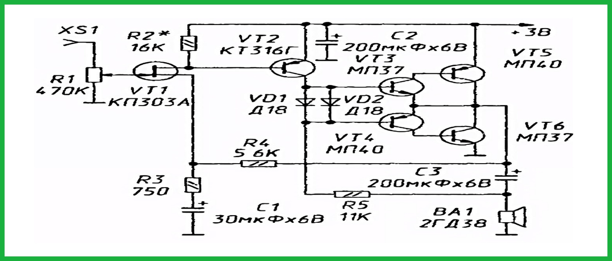 - R2 (16 кОм) - участвует в формировании базового тока VT2.