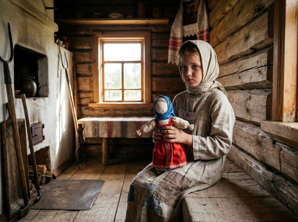 Пальцы нащупали тряпичный свёрток. Катенька вытащила его и ахнула — кукла. Старая, самодельная, без лица. В синем платочке, в красном сарафанчике, с торчащими в стороны мягкими ручками.