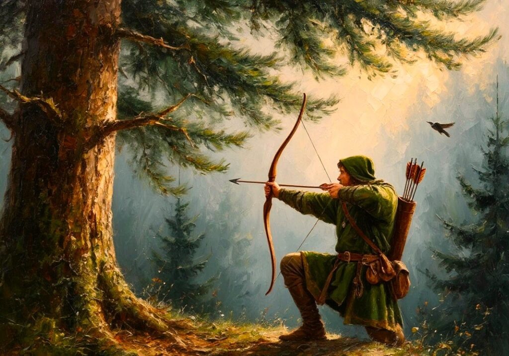 Робин Гуд в лесах Ноттингема Когда-то давно, в туманных лесах Ноттингема, жил человек, который стал легендой. Робин Гуд -имя, знакомое и детям, и взрослым. Эта история, полная приключений, дружбы и доброты, перенесёт вас в октябрьский день 1194 года, когда утренний туман ещё окутывает тропы Шервудского леса… Утро в лесах Ноттингема выдалось холодным и туманным. Серая дымка стелилась по земле, окутывая деревья призрачным покрывалом. Лучи восходящего солнца едва пробивались сквозь густой туман, золотя верхушки деревьев и рассыпая редкие блики на влажной траве. Под могучей елью, чьи ветви раскинулись, словно надёжный шатёр, стоял Робин Гуд. Его фигура чётко выделялась на фоне серебристого тумана: плащ с капюшоном, перетянутый поясом, колчан со стрелами за спиной и крепкий лук в руках. Робин был сосредоточен — он охотился. Робин поднял лук, аккуратно вложил стрелу в тетиву и натянул её. Его взгляд, зоркий, как у ястреба, устремился в небо. Там, высоко над лесом, парила крупная птица — возм