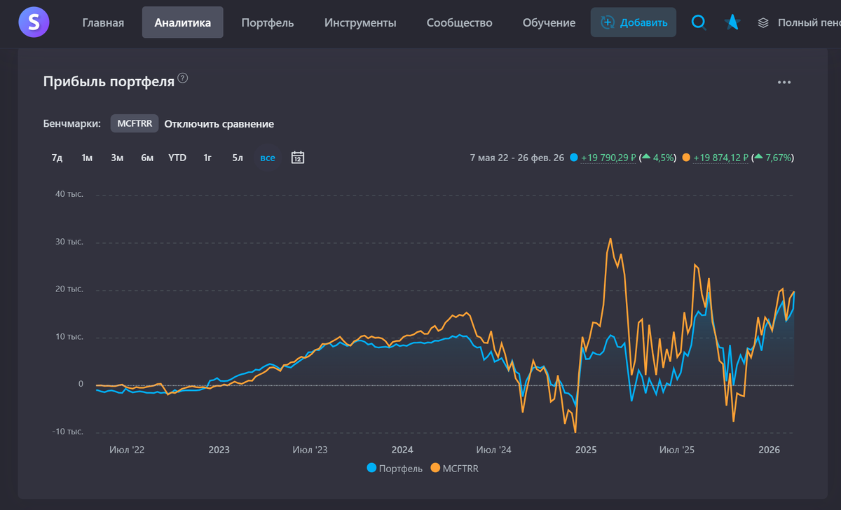Прибыль пенсионного портфеля за всё время в сравнении с MCFTRR